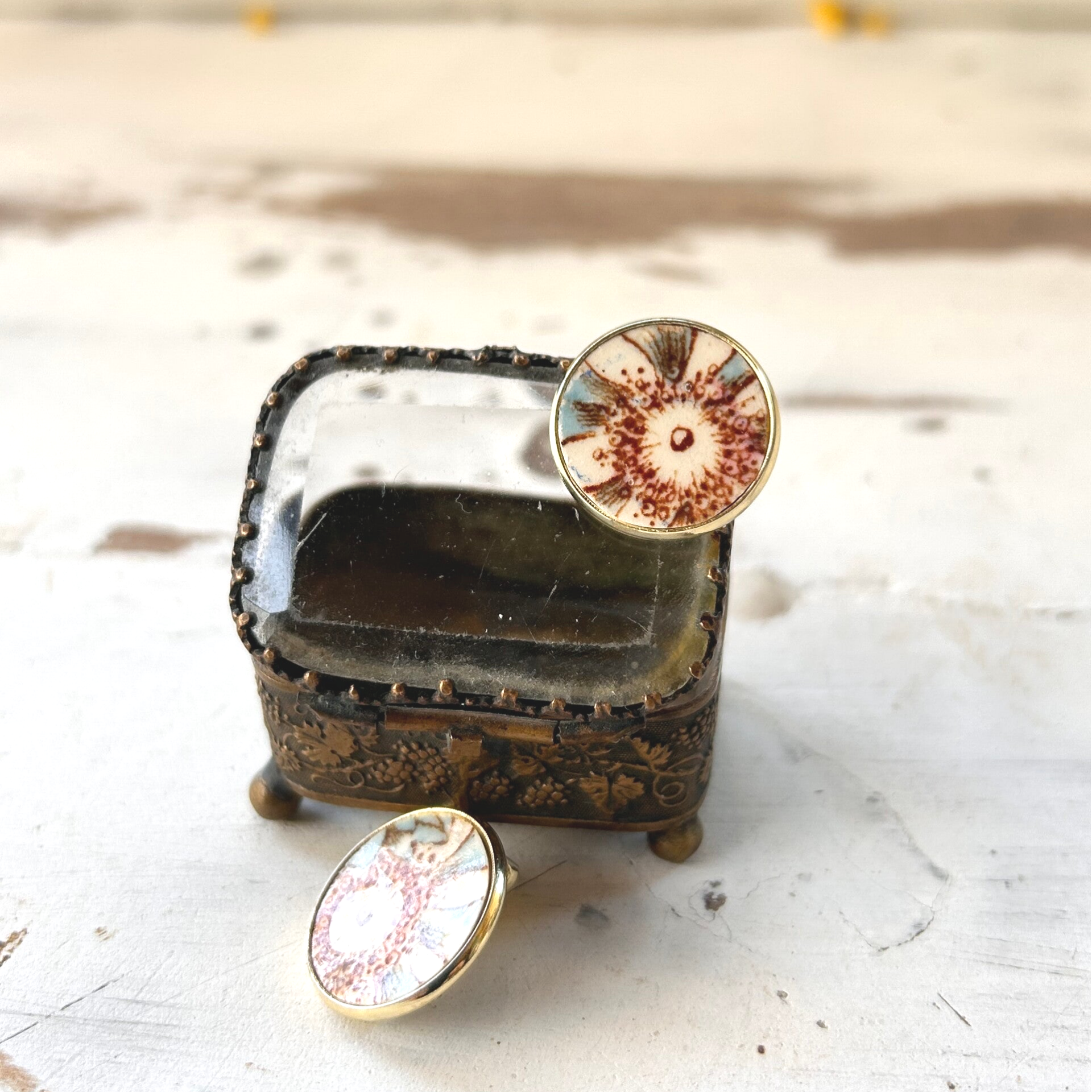 Ils sont façonnés à la main à partir d’une assiette ancienne polychrome de Lunéville, soigneusement sélectionnée pour la richesse de ses motifs et de ses couleurs.