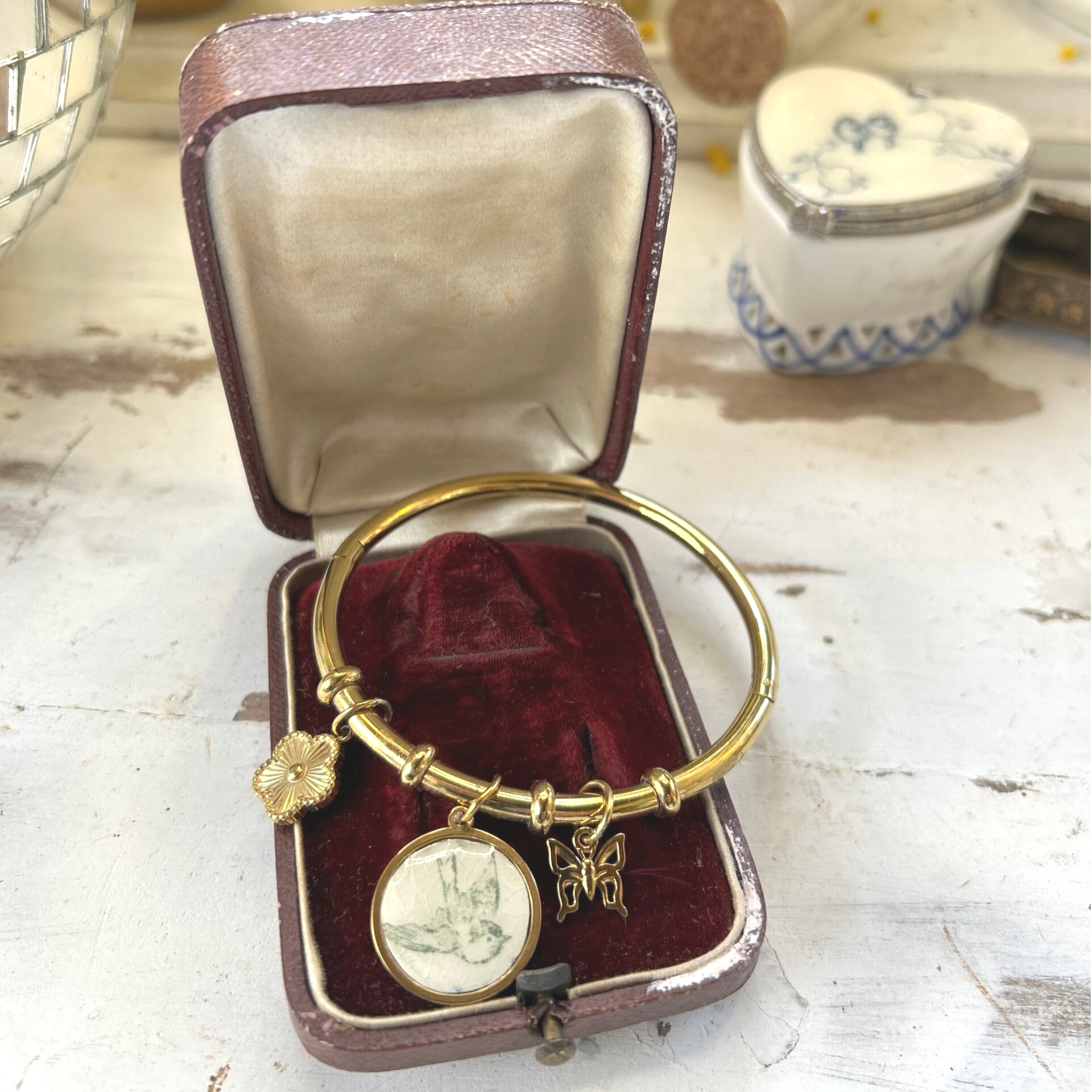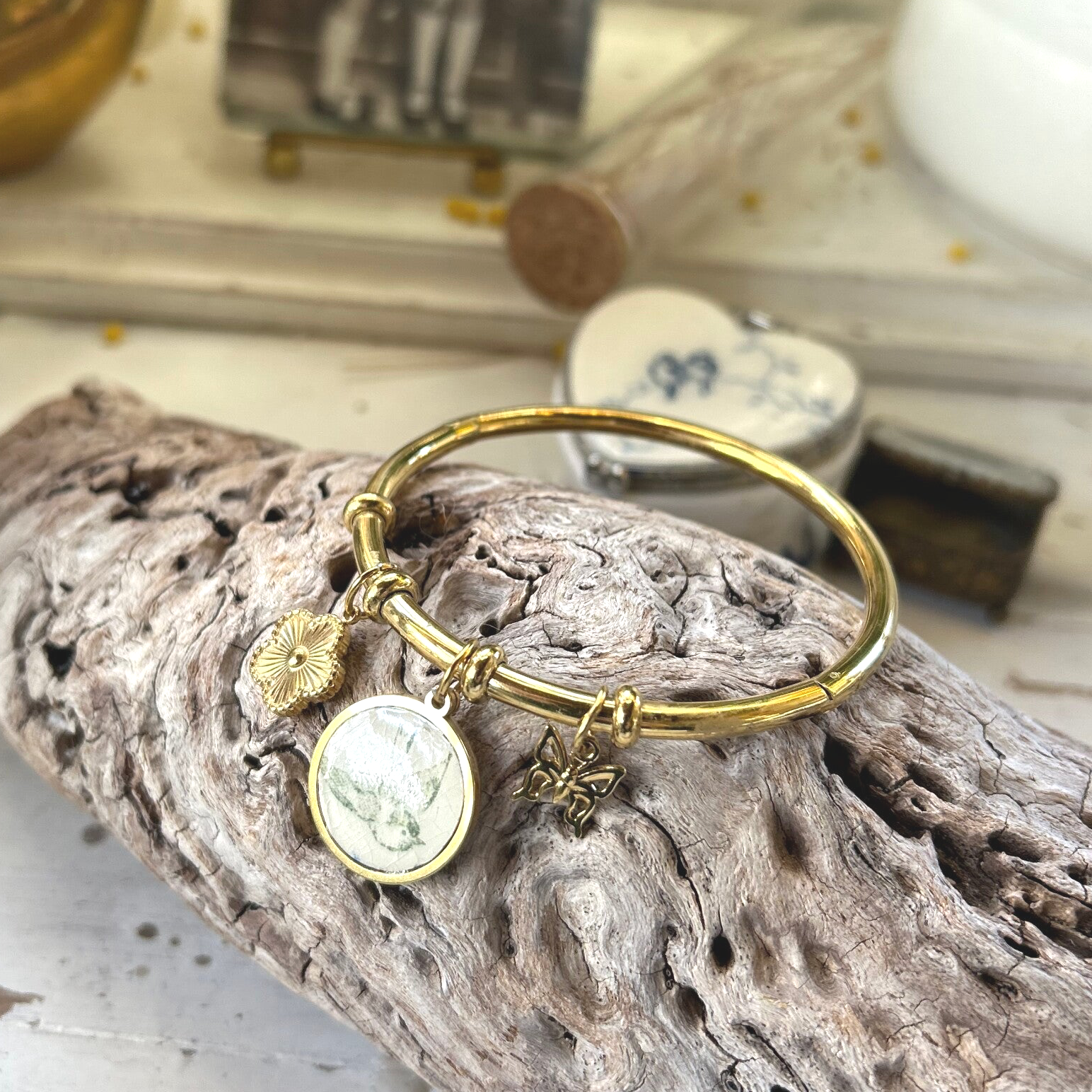 Un jonc délicat en acier inoxydable, orné de petites breloques qui racontent une histoire.
