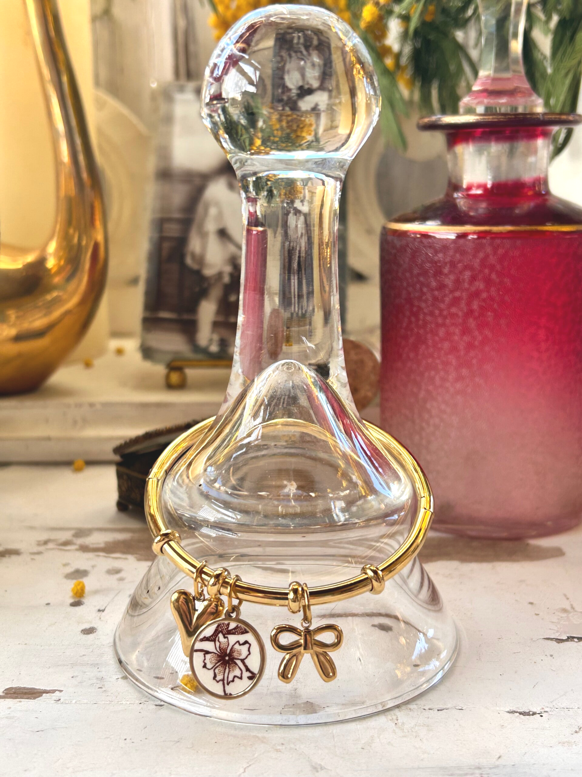 Un jonc délicat en acier inoxydable, orné de petites breloques qui racontent une histoire.