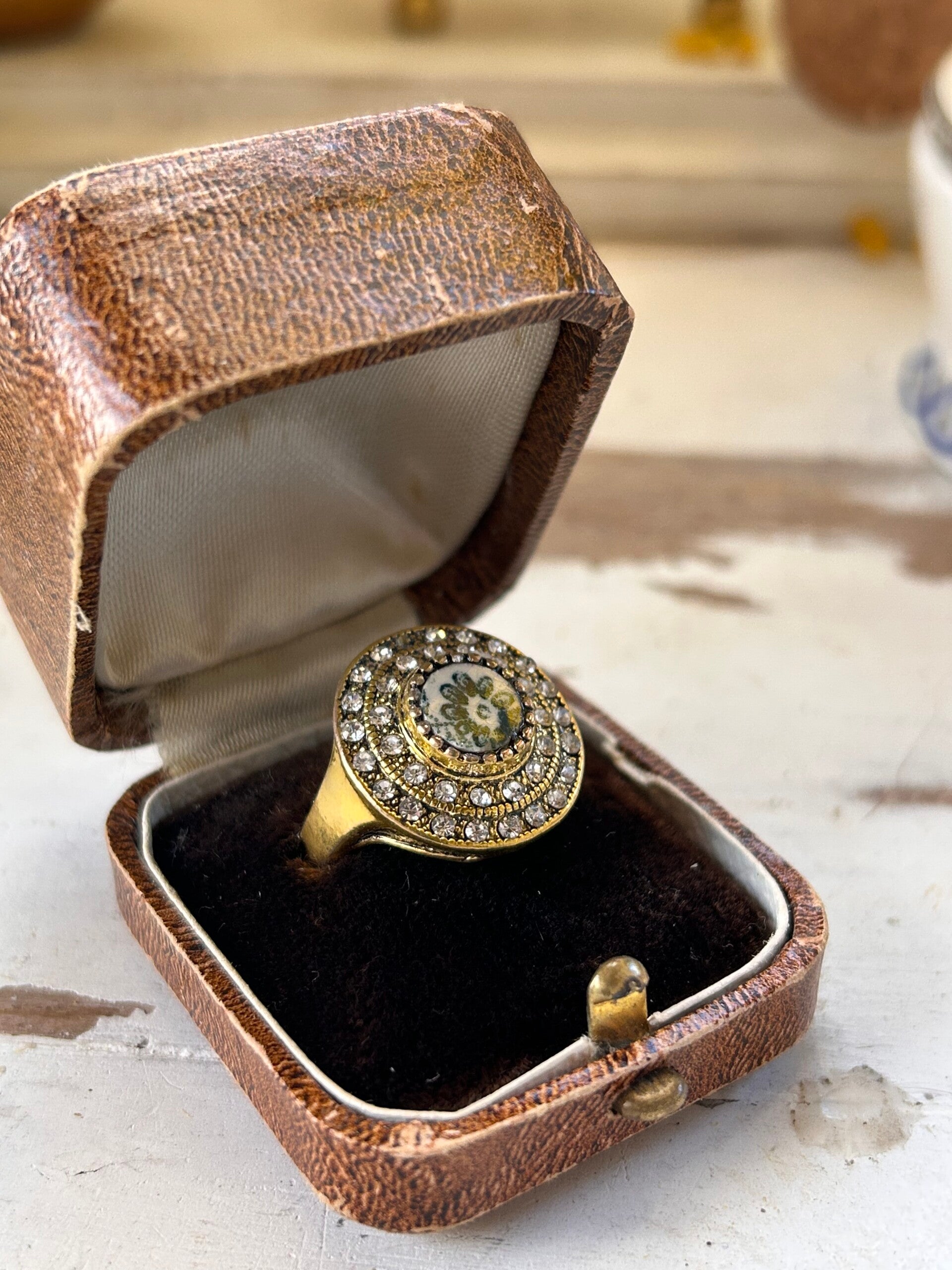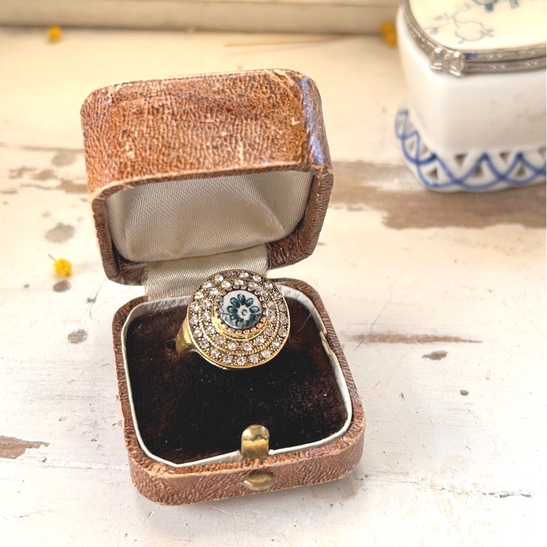 Bague raffinée mettant en valeur un médaillon taillé à la main dans une assiette ancienne, au motif fleuri bleu délicat.