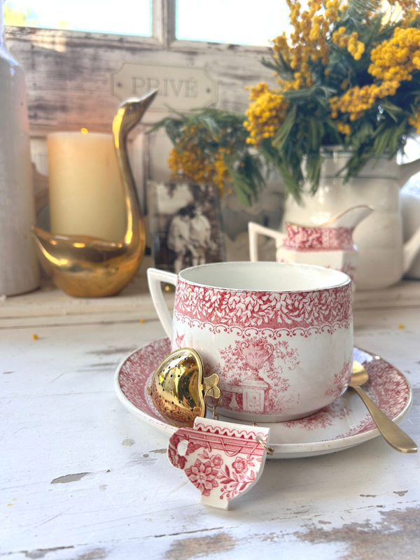 Un infuseur à thé aussi poétique qu’utile. Son pendentif en forme de tasse est taille dans une assiette ancienne en terre de fer