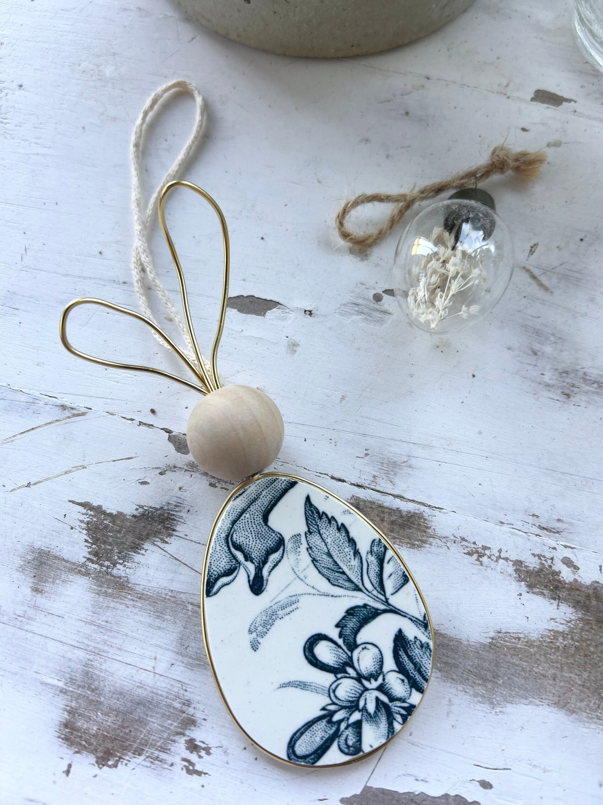 Lapin à suspendre taillé dans une assiette Luneville modèle azalées