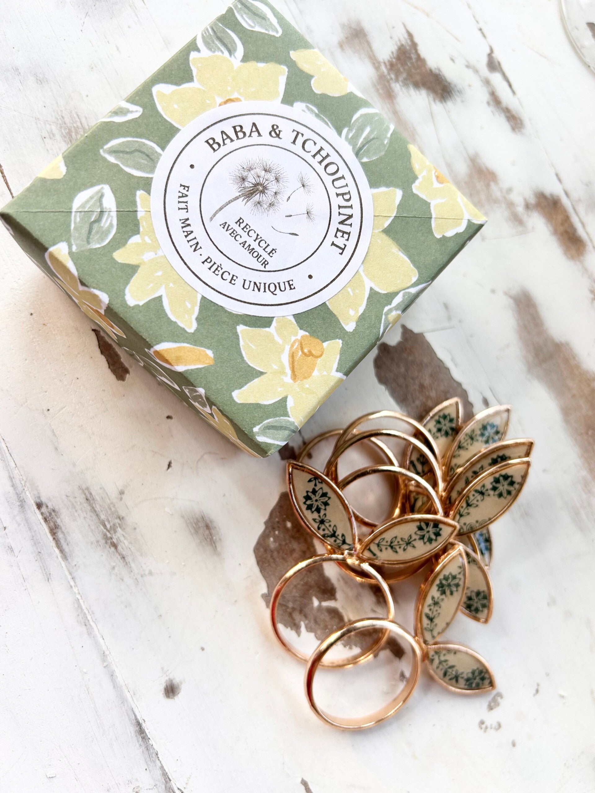 Chaque pièce est ornée de deux « oreilles » délicatement serties, réalisées à partir de fragments d’assiettes anciennes soigneusement sélectionnées.
