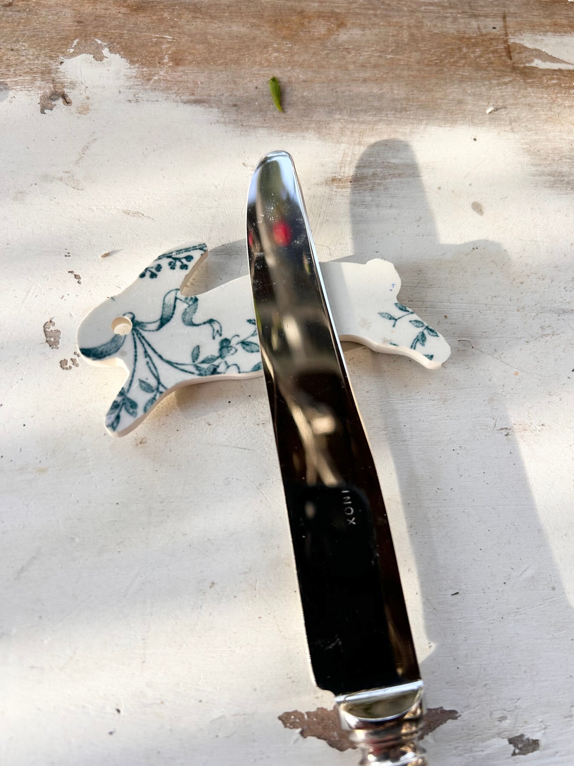 Ces délicats lapins porte-couteaux sont nés d’une assiette ancienne abîmée. Fêlée par le temps, devenue impropre à son usage premier, l’assiette a trouvé ici une seconde vie, transformée avec soin en objets de table aussi décoratifs qu’utiles. Ici une assiette Sarreguemines modéle Mozart