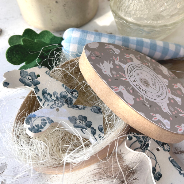Charmant lot de 6 petits lapins décoratifs soigneusement taillés dans une ancienne assiette en Terre de Fer Longwy, modèle Chartres bleu. Chaque pièce est unique et conserve le charme délicat du décor floral bleu caractéristique de cette faïence ancienne.