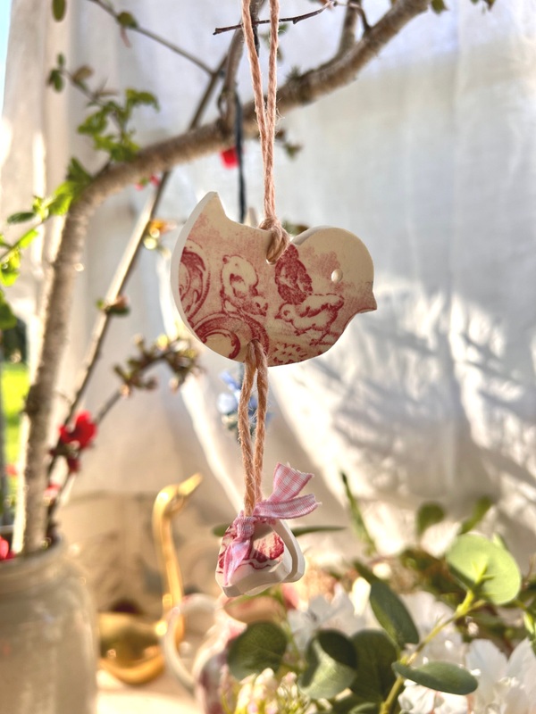 Chaque pièce est taillée à la main dans de la vaisselle ancienne, ce qui rend chaque poussin unique. Le décor d’origine de l’assiette lui donne tout son charme