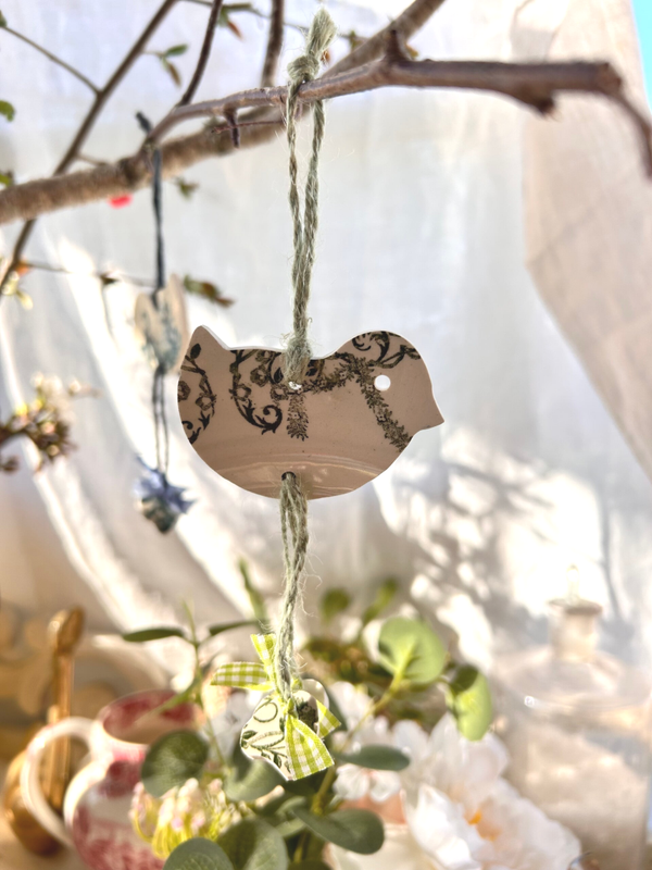 Petit poussin à suspendre, délicatement découpé dans une assiette ancienne en terre de fer.