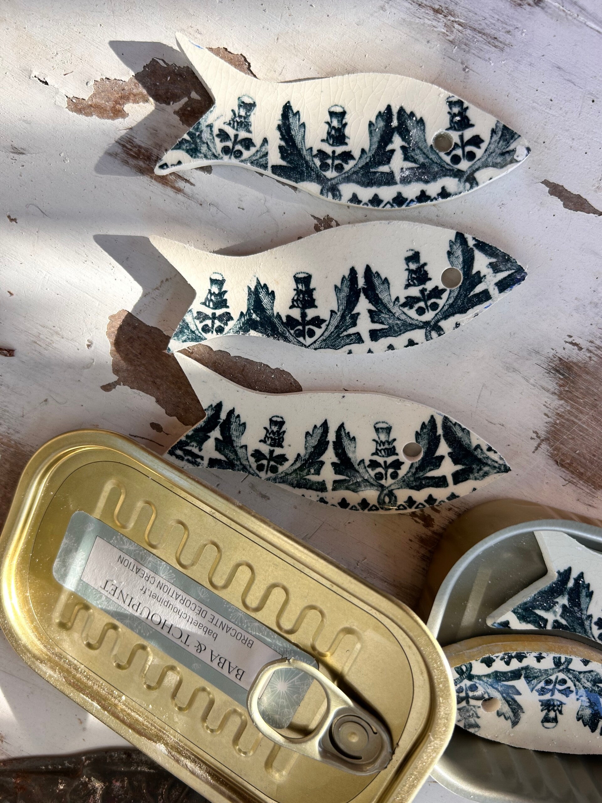 À l’intérieur, six sardines ont été taillées à la main dans une assiette ancienne en faïence Terre de Fer, signée Salins – modèle Lorraine.