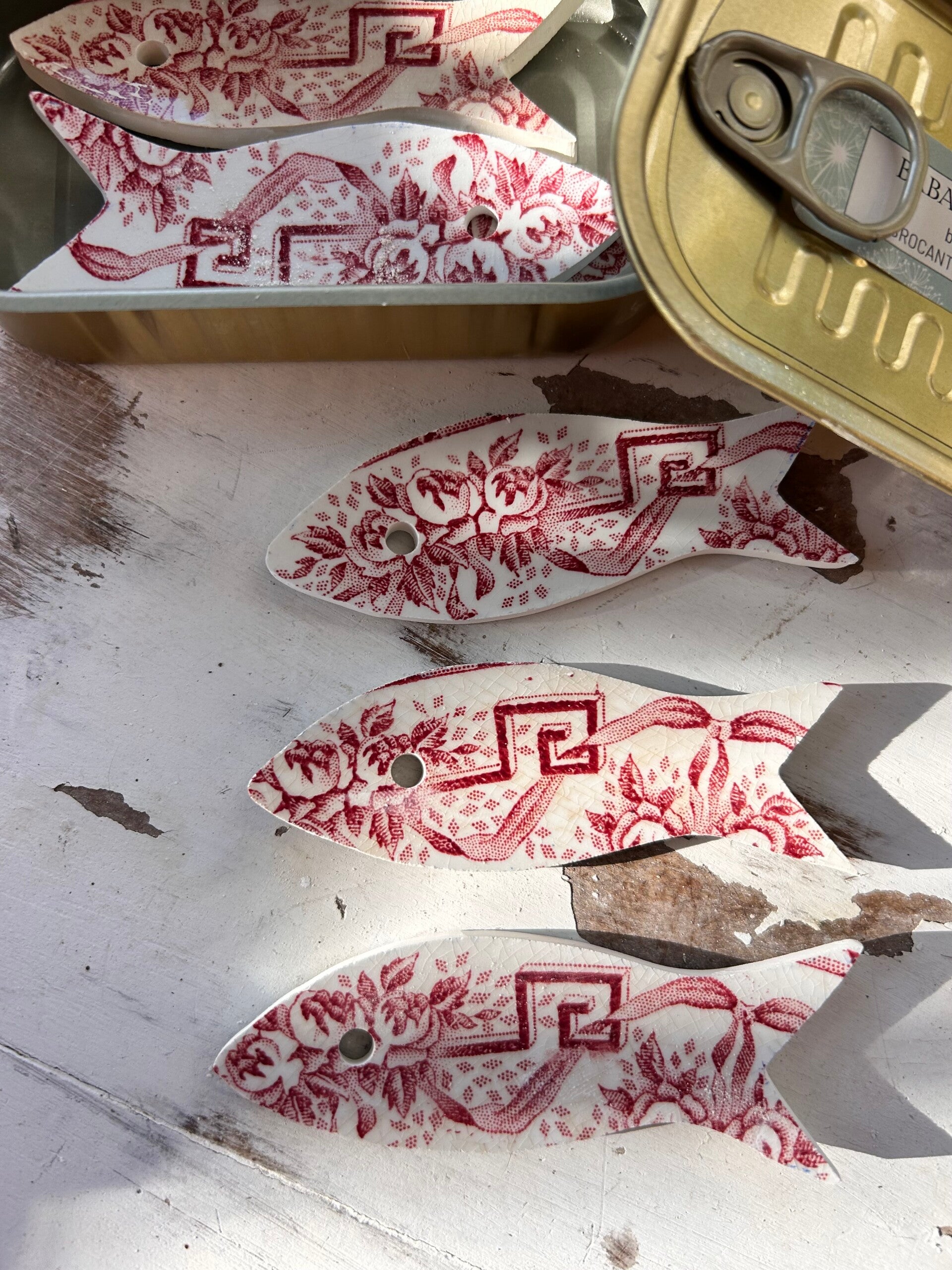 Chaque poisson conserve les traces délicates du décor d’origine, offrant un jeu de motifs et de teintes qui rendent chaque pièce singulière.