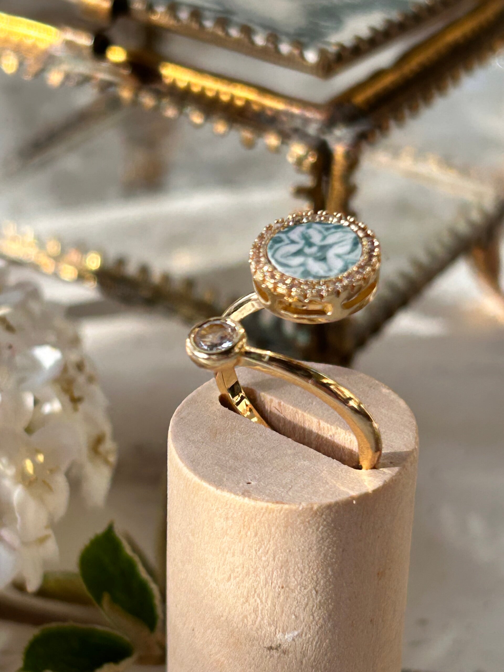 Le cabochon central est monté sur un axe mobile : il tourne délicatement sous les doigts, offrant un geste apaisant et anti-stress.